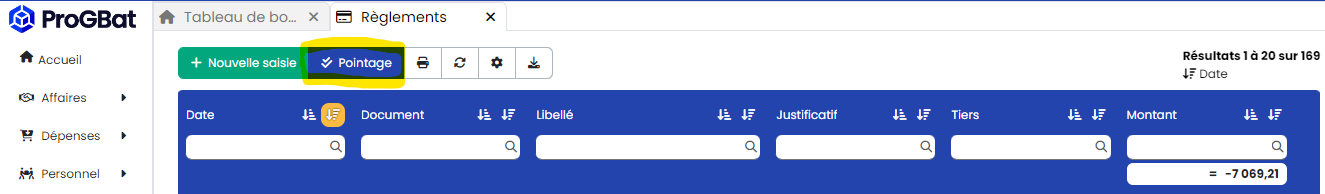 <mark style="background-color:red;">Vos opérations bancaires seront disponibles dans le menu</mark> <mark style="background-color:red;"></mark><mark style="background-color:red;">**"Gestion -> Règlements",**</mark> <mark style="background-color:red;"></mark><mark style="background-color:red;">grâce au</mark> <mark style="background-color:red;"></mark><mark style="background-color:red;">**bouton de pointage.**</mark>