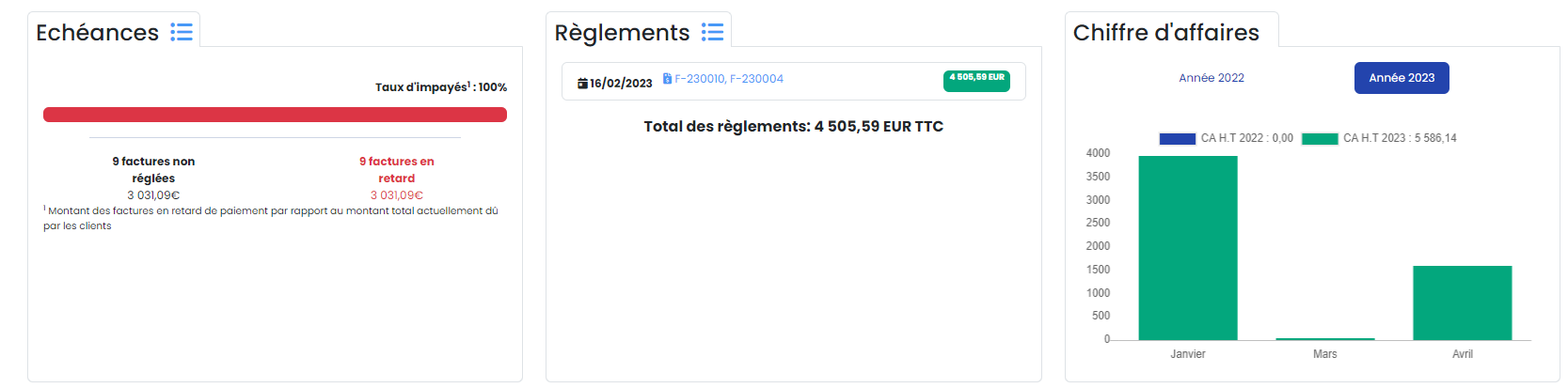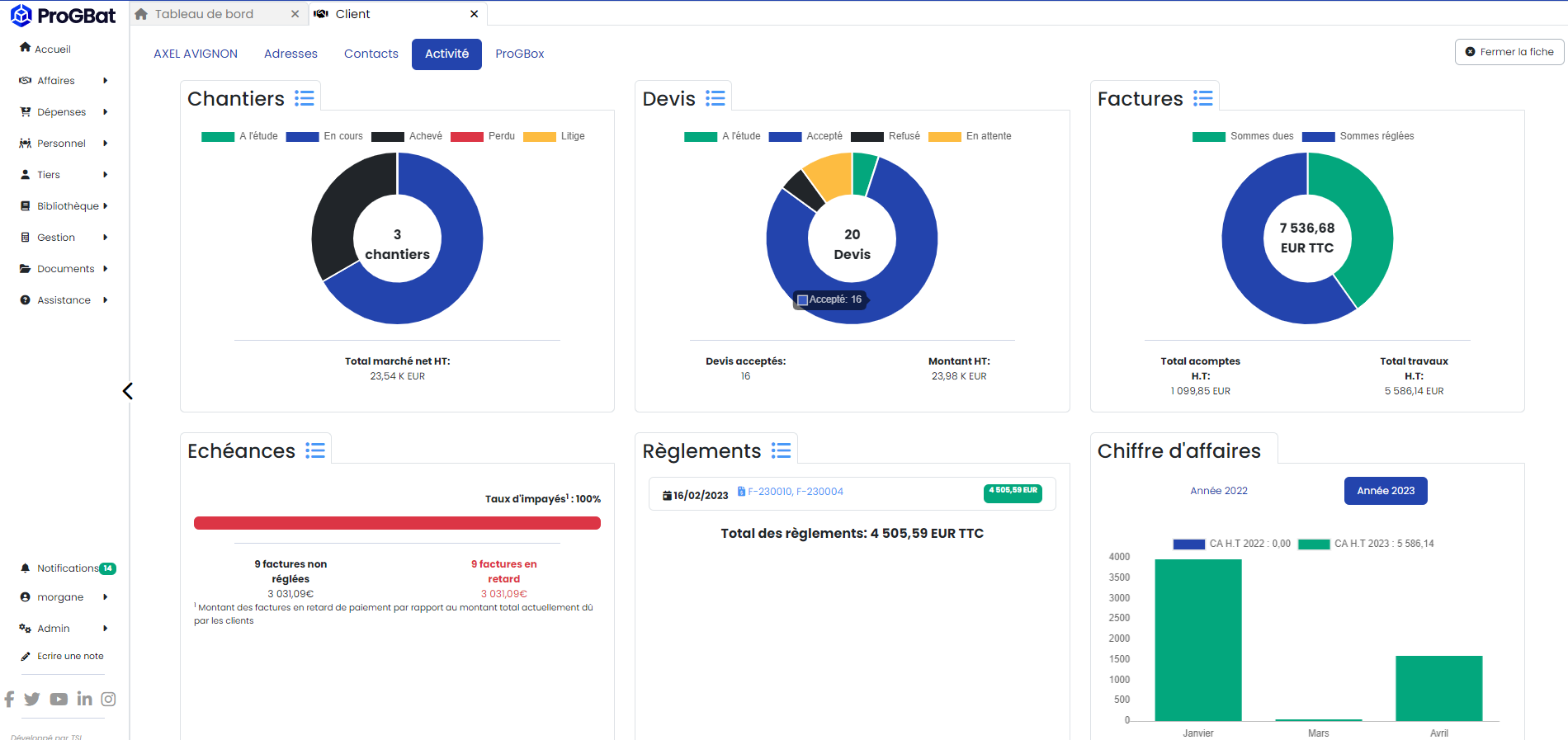 Historique et proportion des montants facturés à ce client, et ceux réglés.