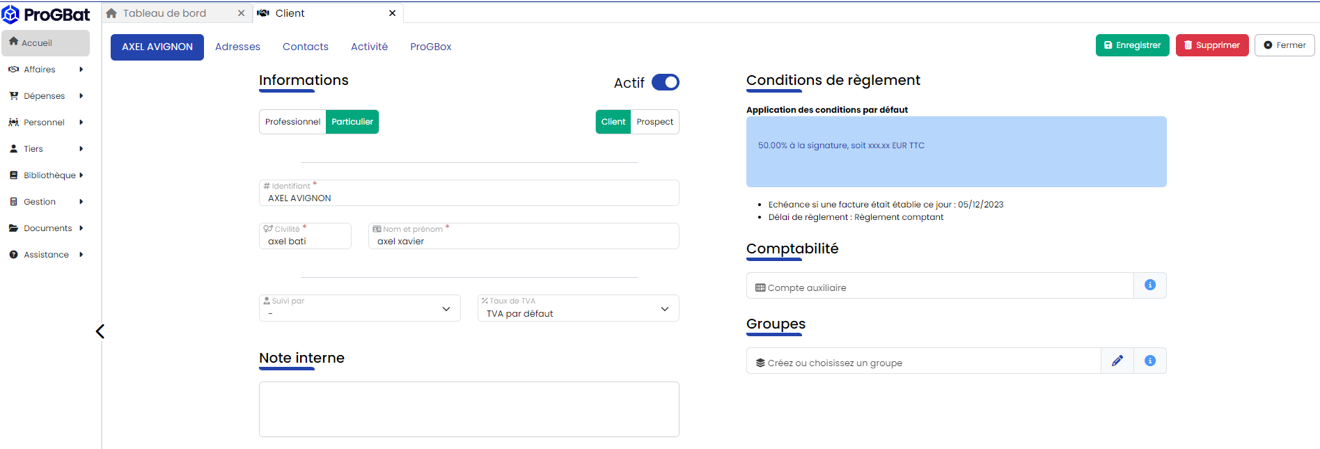 Ce taux sera appliqué automatiquement à la création d'un devis/facture pour ce client, et sera prioritaire face au taux de TVA sélectionné dans vos préférences utilisateur (Menu "Utilisateur > Préférences"). Vous pourrez bien sûr modifier ce taux à volonté depuis vos documents, et ainsi l'ajuster en fonction des travaux à réaliser.