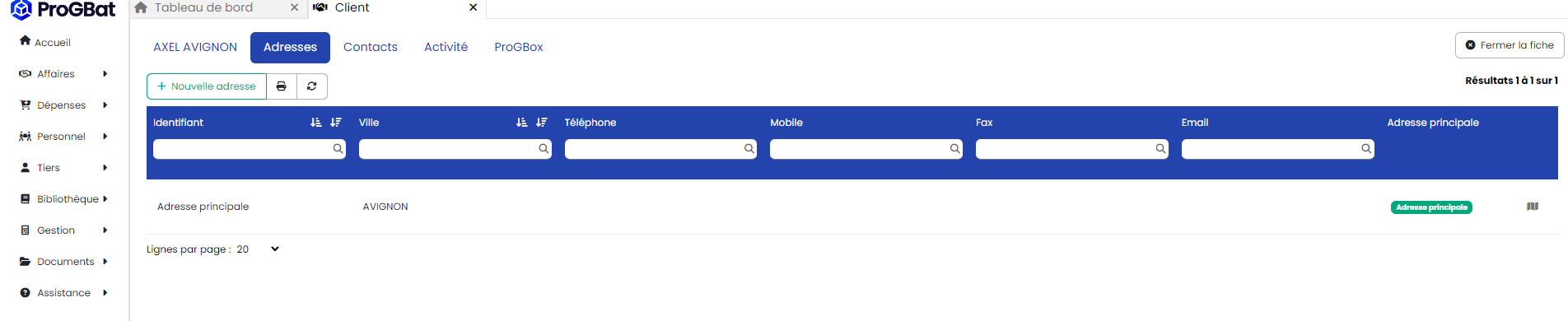 Par défaut, la première adresse saisie est considérée comme "Adresse principale", c'est celle-ci qui figurera sur vos devis / factures créés pour ce client.